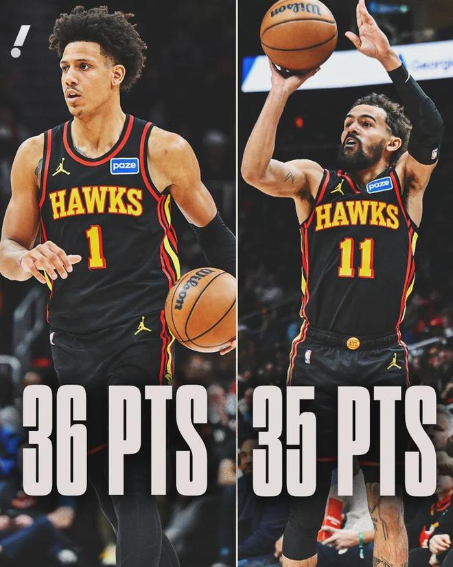 后特雷杨时代的老鹰,在新鹰王杰伦-约翰逊带领下重新展翅高飞,后者现年24岁,身高2米03的大前锋,本赛季至今场均22.9分10.5板8.1助1.3断全面数据进账,三项命中率49.3%、35%和78%。